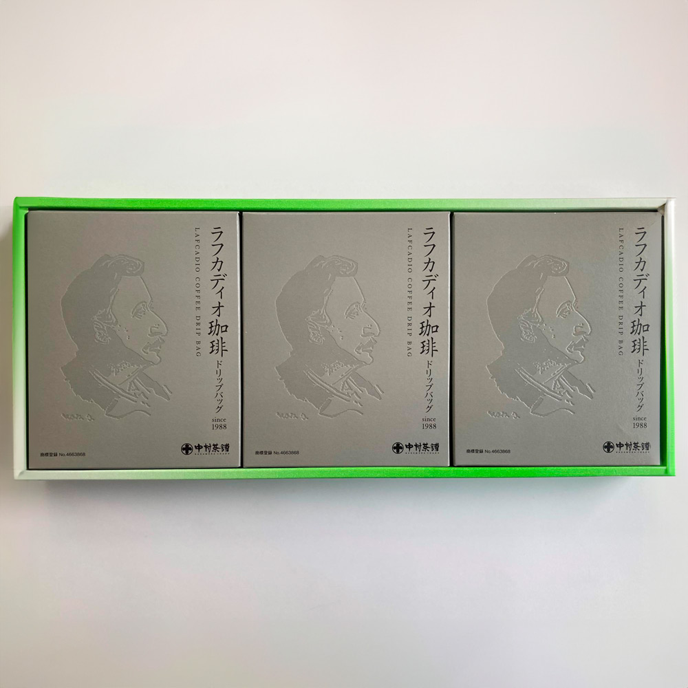 「ラフカディオ珈琲」は4代目が小泉八雲の曾孫・小泉凡様にご助言、ご試飲いただき誕生した中村茶舗オリジナル珈琲です。カップにドリップバッグをのせ、お湯を注ぐだけで本格珈琲がお楽しみいただけます。浅煎りで苦味は少なく、豆本来の風味や甘みをお楽しみいただけます。※こちらは3箱詰め合わせになります。
